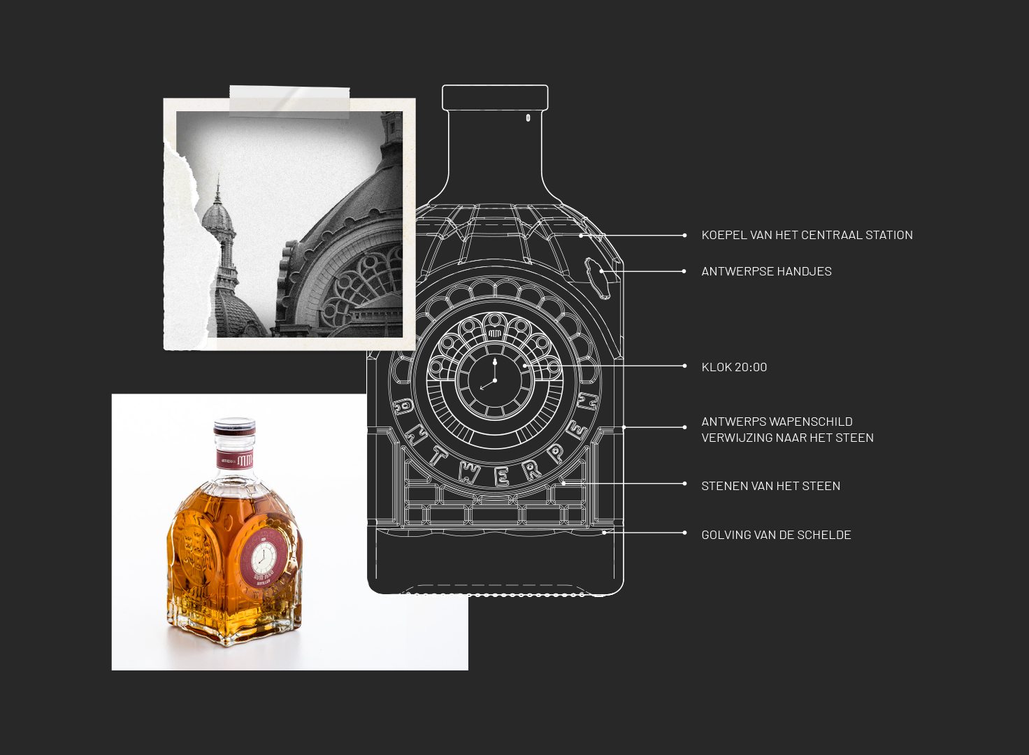 Geïnspireerd door het grote Centraal Station van Antwerpen dat bekend is om zijn indrukwekkende architectuur en beschouwd als een van de mooiste treinstations ter wereld. De fles draagt belangrijke symbolen van de stad Antwerpen in zijn fijne details.