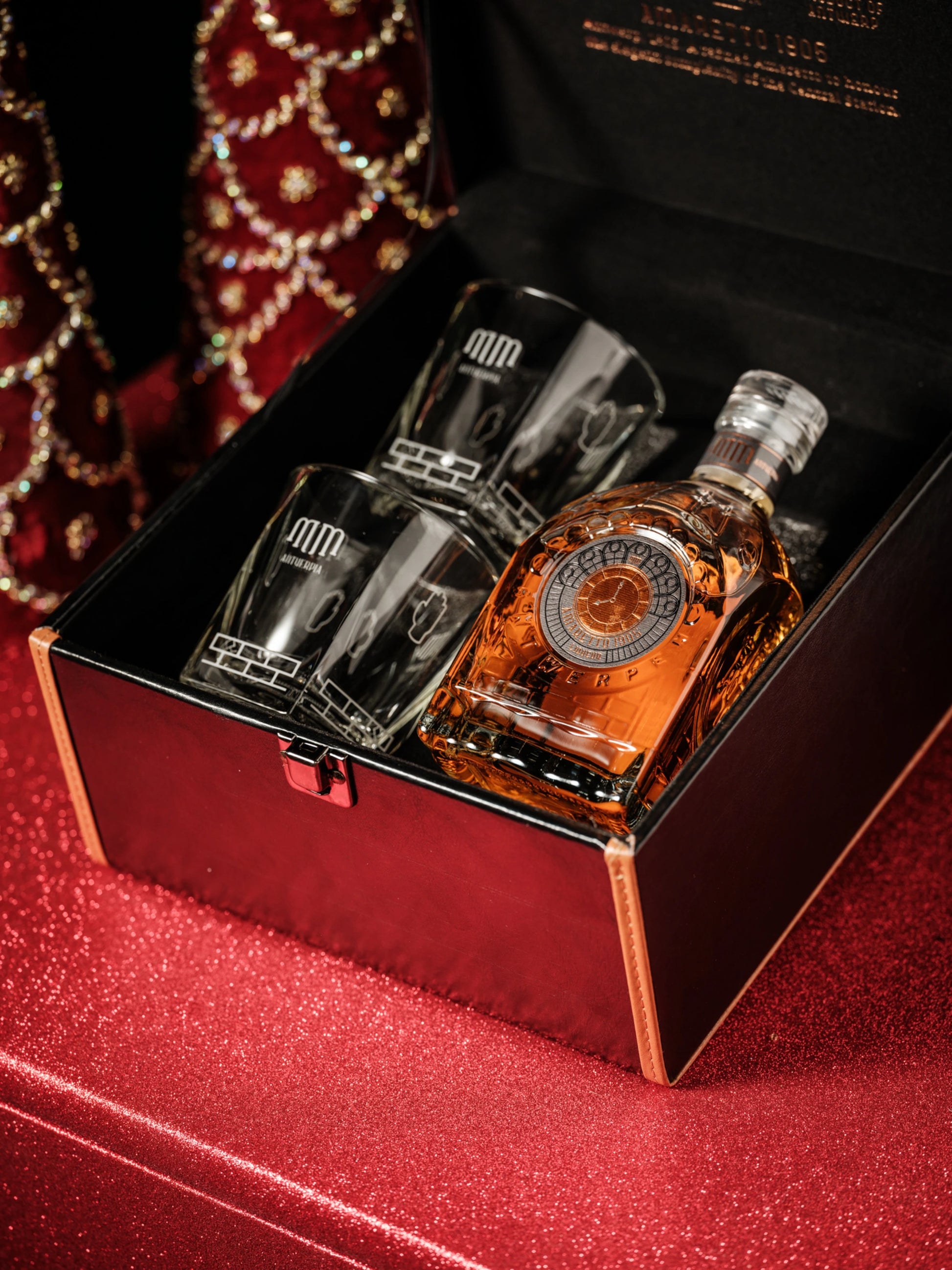 Inbegrepen: Lederen MM koffer, 1 fles Amaretto 1905, 2 glazen